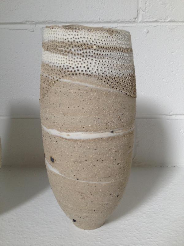 Hand pierced and water etched mixed recycled clays with porcelain