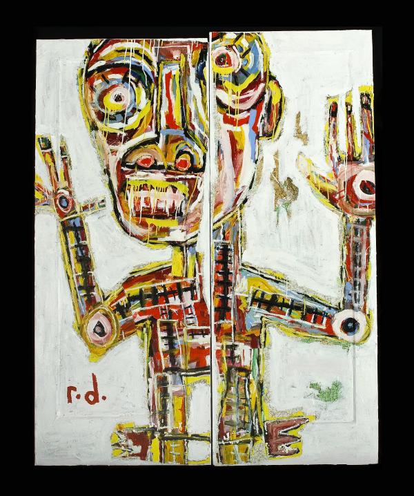 As the overlord of general semantics Alfred Korzybski once said: “A map is not the territory”. This highlights the notion that one can peer at a map, and understand the layout of the land via it, but the map will only ever signify the geography of what is there, never accurately describe its nuances. By deploying the found maps as an actual canvas, and a basis for his characters, Richard Denny has found a means of dripping flavours of personality and territory over the maps. Using the lines of contour, river, border and road, Richard Denny paints in his own lines, shapes and textures. Later, from these cartographic cross-hatchings emerge characters representing people, daily experiences and settings.